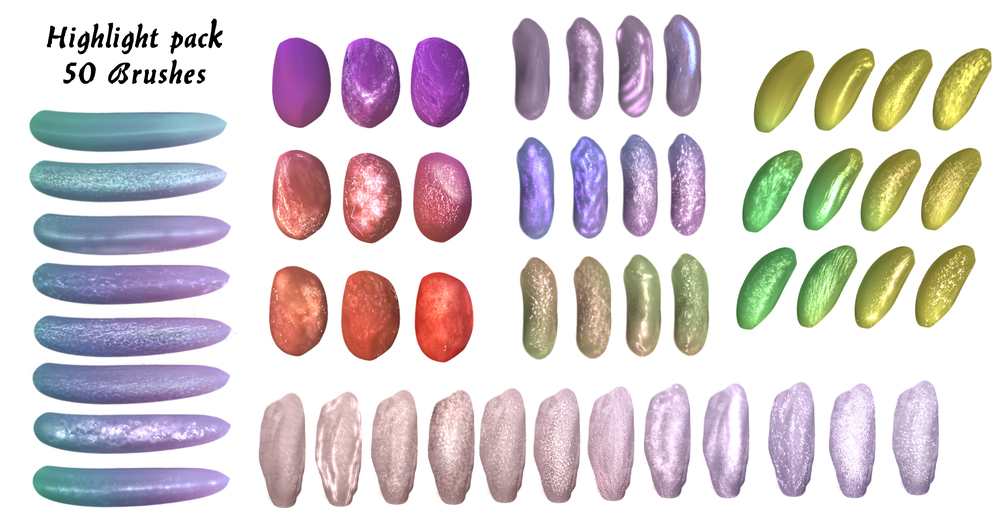 50 brushes to apply with the add glow, overlay and glow dodge fusion mode mainly.